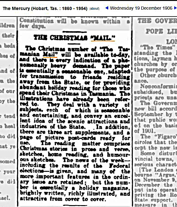 The Tasmanian Mail postcards are b&w cards that were issued as inserts in the Christmas Numbers of The Tasmanian Mail in 1905 and 1906. The item at left, from The Mercury of 19 December, 1906, is an advertisement for the Christmas Number of 1906. In the middle of this paragraph it mentions "a page of picture postcards ready for use". A year before, a similar article advertising the 1905 Christmas Number said "... picture postcards, of which a page will be in the Christmas Number of "The Tasmanian Mail". Perforated and ready for mailing, they depict Tasmanian scenery, progress and flora."
