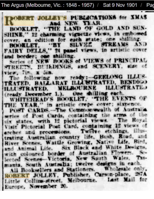 Series Contents: The advertisement shown below is from the Melbourne newspaper The Argus, of 9 November, 1901. In the secion about this series it says " ... containing the arms of the six states, with 12 pictorial views". This may mean 12 views of each state or 12 in total, but as I already have seen three of Tasmania, it probaly means 12 of each state.