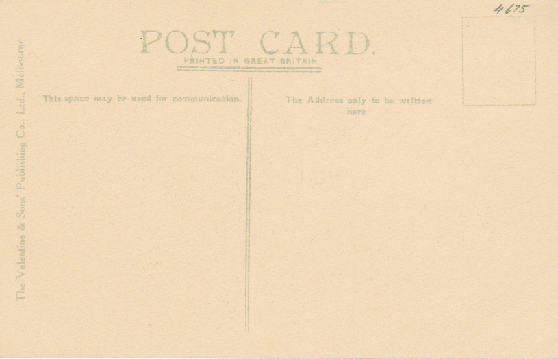 Identification: The imprint on the back left margin is “The Valentine & Sons’ Publishing Co., Ltd., Melbourne” or “The Valentine & Sons’ Publishing Co., Ltd., Melbourne”. Why some are Melbourne and some are Sydney is not clear; perhaps there were two printings. Some cards have photo numbers of 6 digits starting with 300 on the front, but others have no number at all, probably because of cropping for the frame.