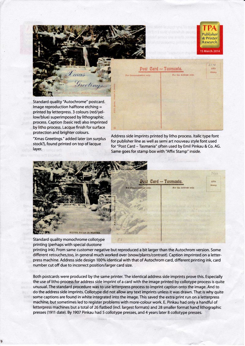 Without the printers name being on the cards it was necessary to deduce the printer from the printing method, card layout and printing fonts. Helmfried Leurs kindly did this analysis and provided a detailed report which is included below.