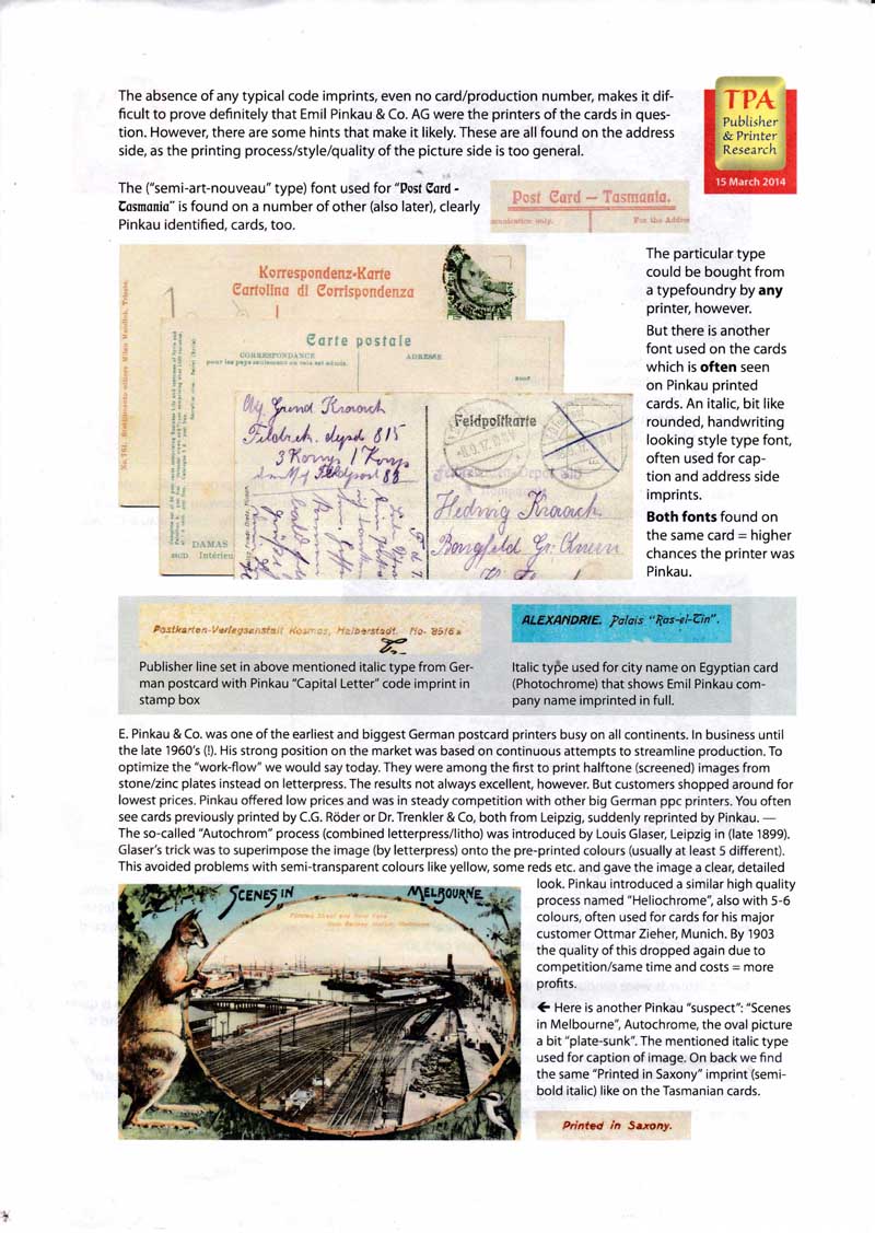 Printer: The three styles of cards were all printed by Emil Pinkau & Co, Leipzig, Germany, in 1910. The printing process was different for each style: