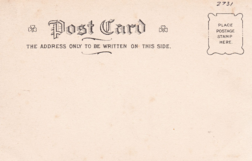 Identification: The name "A. Mather & Co." is on the front bottom left. The back layout has "Post Card" printed in black in an elaborate script, with shamrocks on both sides. The stamp box has an unusual outline, partly dotted, which may help in identifying the printer.