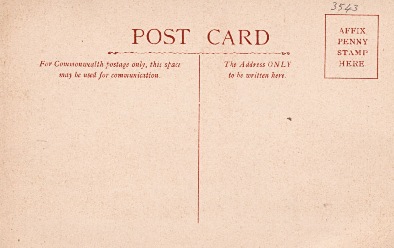 Identification: The A. Mather & Co. name is printed on the front of the card, in the white margin under the picture. There is no series name or identifying numbers. The card backs are printed in pinkish brown; with the words "AFFIX PENNY STAMP HERE" in the stamp box. A unique feature of the series is the unusual wiggly horizontal line under the words "POST CARD".