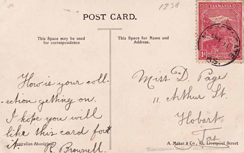 Identification: Picture side with a caption in white at the bottom left. Address side with "Australian Aboriginal" at the bottom left, and "A. Mather & Co., 93 LIverpool Street" at the bottom right. The words POST CARD are in unusually small font, and are but different between the two cards shown here!