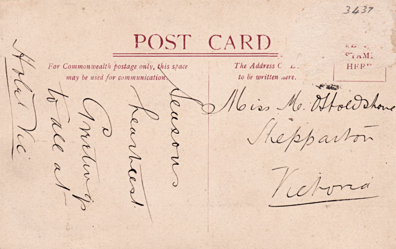 Identification: The picture side has a margin at the botton containing the caption and the publishers line "A. Mather & Co., 93 & 95 Liverpool Street, Hobart". The address side is printed in maroon, with "PENNY STAMP HERE" in the stamp box.