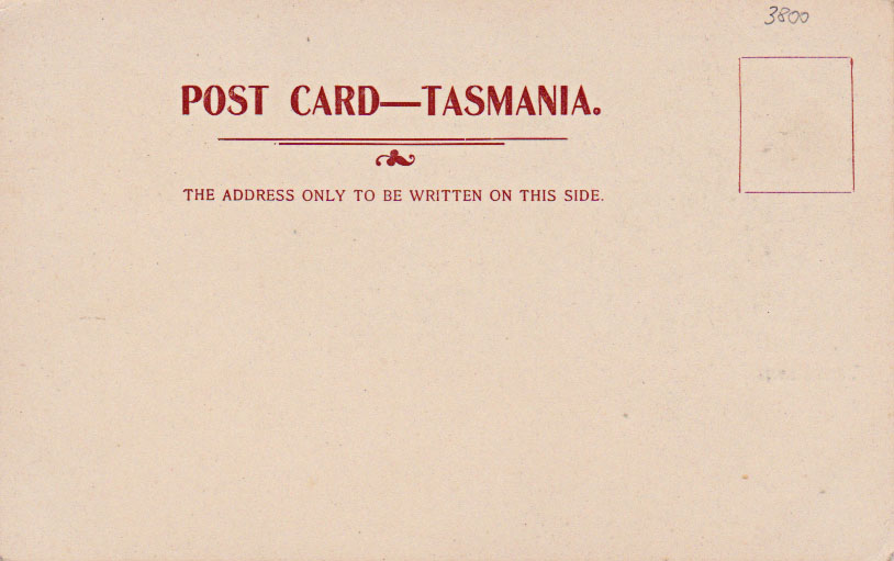 The undivided back has "POST CARD - TASMANIA." in a heavy, red printing, with two lines below, and under that a curly symbol that is unique to this series. The stamp box is of thin solid lines.
