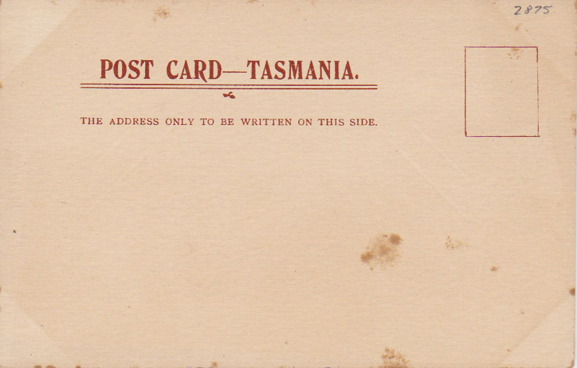 Identification: The front of the cards has a vignetted image printed by collotype and hand coloured, with caption in italic black. The imprint "J. Walch & Sons, Hobart." is along the left edge. The back has "POST CARD --TASMANIA" in red serif font, the same as the 1901 and 1902 series, but the symbol below the double red lines is different.