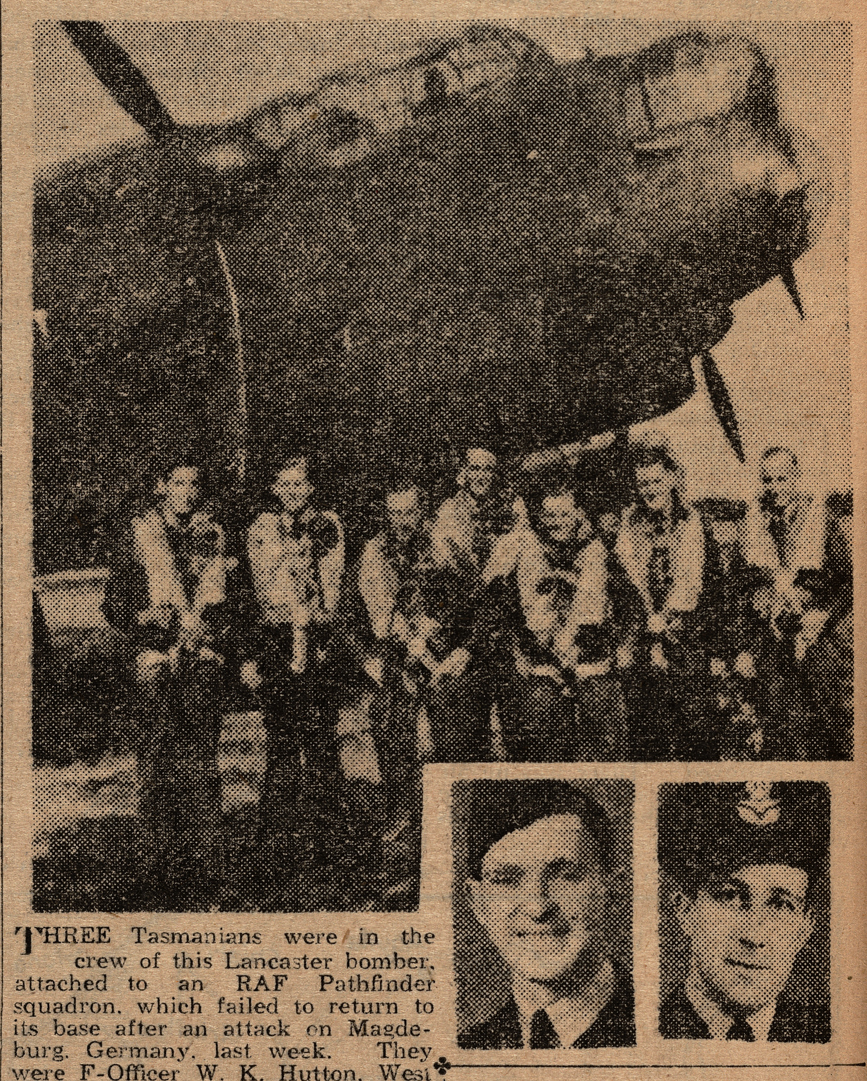 G.M. Breaden (inset, left) and plane and crew shot down over Magdeburtg, Germany. (Photo from Mercury, 28 January, 1944, via Trove)