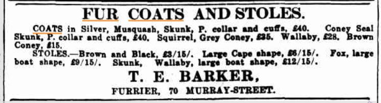 Thomas Edward Barker was a furrier in Hobart for over 60 years. Born in 1854, he took over his father’s furrier business which had been established in 1842. In 1878 he was trading under his own name as T.E. Barker, and advertised, among a variety of goods, English and Colonial boots “cheaper than any other bootmaker in town”.