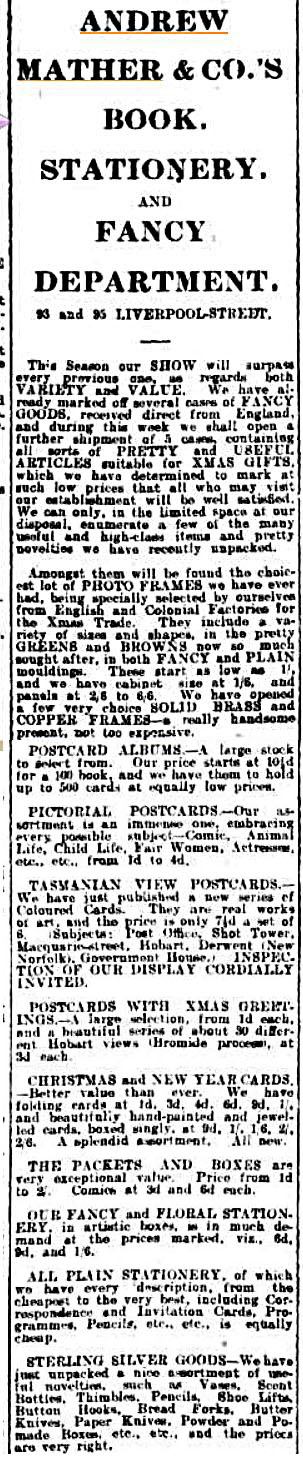 Mather’s incursion into postcard publishing and selling was brief, coinciding with the boom years of collecting. The earliest of their cards that I have seen is postmarked 1903, and the latest is 1911. Hobart Streets were re-numbered in 1908, so their street number changed from 93-95 to 111-113 Liverpool St, but all their cards that carry an address have the earlier numbers, suggesting they were out of the field by 1908.