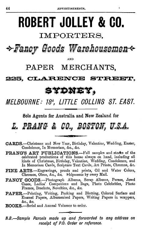 Jolley was not a printer or photographer, but an importer, merchant and publisher. One of his main lines was the attractive chromolithographed greetings cards of the American publisher L. Prang & Co., which he continued to advertise over the next decades. He was also strong in “Fancy Goods”, which he itemized in his advertisement: