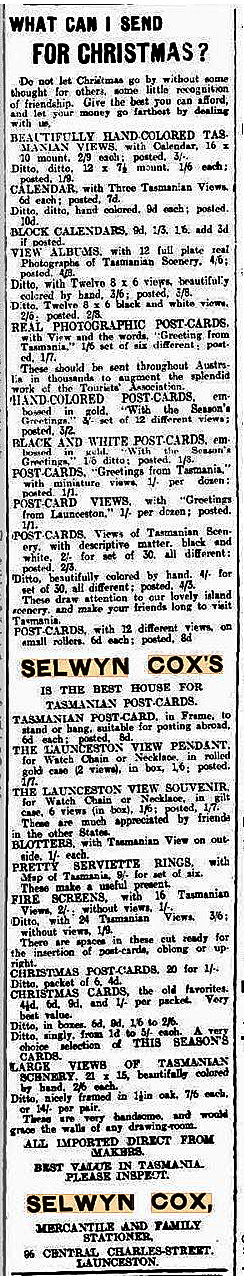 Selwyn Cox was a stationer, operating from a shop at 96 Charles Street, Launceston from 1905 until his retirement in 1941, a few months before he died. He sold a full range of stationery and associated items, as shown in his advertisement for Christmas of 1906 shown at left.