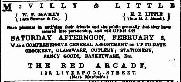 The McVilly & Little shop was initially at 125 Liverpool Street, on the northern side of the street a few doors up from Murray Street. In 1904 they moved a hundred metres down Liverpool Street to number 101, a few doors below Murray Street. But the street was re-numbered in 1908, and their number changed to 123, making it appear they had just moved next door! They advertised their shop as The Red Arcade; I haven’t seen a photograph, but presumably it was painted red.
